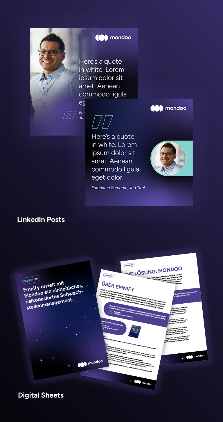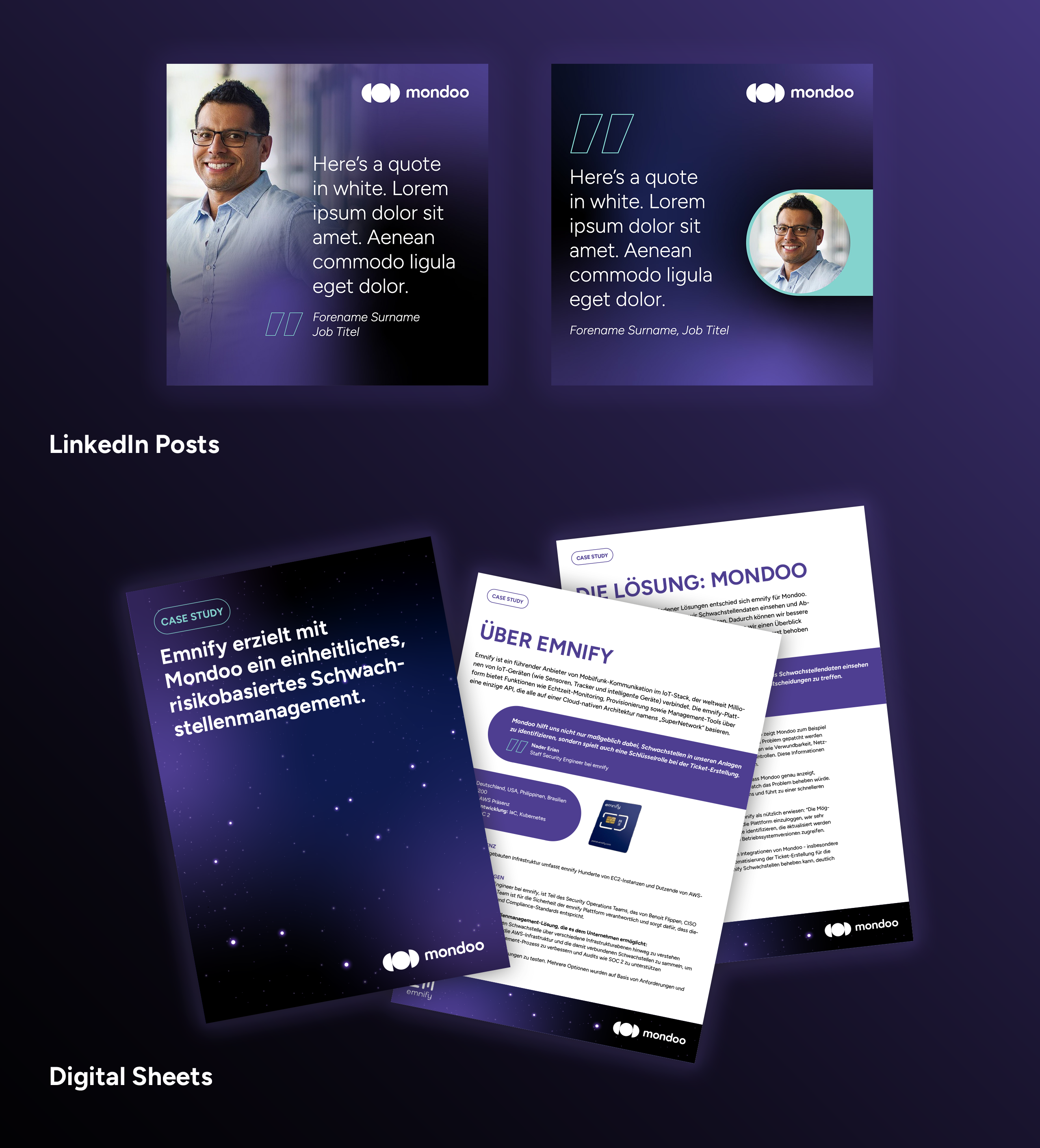 Wir machten uns ans Werk und riefen zunächst einmal neue Farb- und Stilwelten ins Leben. Im Rahmen einer Workshop-Session präsentierten wir Mondoo unsere Visionen, die Funktionalität, Design und Modernität vereinten. Das Ergebnis: ein komplett neuer Brandguide, der Mondoo völlig neue Möglichkeiten bietet, die Marke zu festigen und den Wachstumskurs nachhaltig zu untermauern. Damit ist das Unternehmen nun bestens für alle Eventualitäten gerüstet – wir freuen uns, wenn Mondoo seinen Wachstumstrend fortsetzt und im Bereich „Schutz der gesamten IT-Infrastruktur“ dank dieser Grundlage zum echten Hit am Markt wird.
